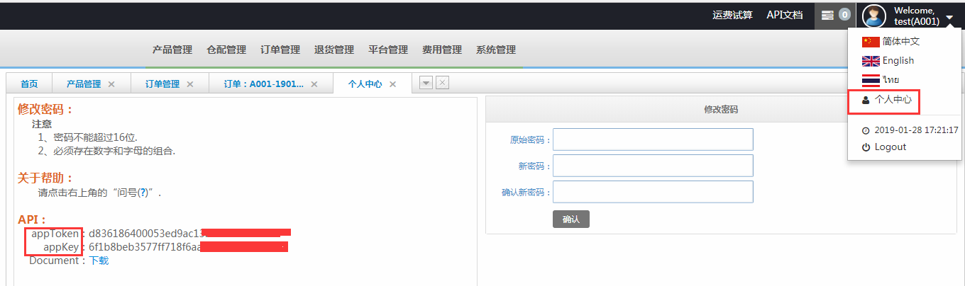 可登錄天府盛海外倉客戶端系統(tǒng)(登錄賬號及密碼可聯(lián)系天府盛銷售獲取),點擊網(wǎng)址 http://www.tfs906wms.com:81 如下圖位置獲取appToken和appKey